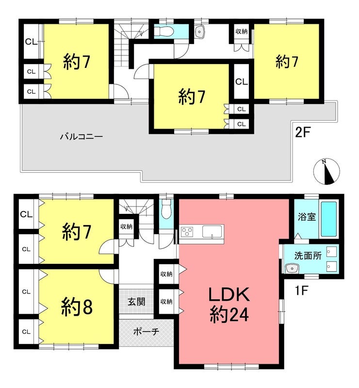 駐車6台可能、頑丈な鉄骨造5LDK。LDKは圧巻の約24帖、個室も全て7帖以上とゆとりの空間設計です。2021年にクロスや水回り全交換、外壁塗装など大規模リフォーム済みで、新築のような快適さ。2階居室は南向きで明るく、ワイドバルコニーも完備。対面キッチンや豊富な収納など、暮らしやすさを追求した設備も充実しており、大家族や二世帯の方にも自信を持っておすすめできる邸宅です。
