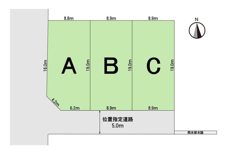 | 土地面積 | 公168.44㎡(50.95坪) | 接道 | 南側(私道)幅 約5.0m 間口 約6.20m 西側(公道)幅 約5.0m 間口 約16.00m |