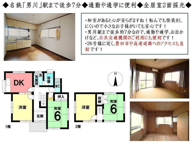 男川駅まで徒歩約7分の駅近物件です。26号線に近く、豊田市や高速道路へのアクセスも良好!通勤や通学、お出かけにも便利な立地です。全居室2面採光のため暖かな陽射しが差し込み明るい室内です。