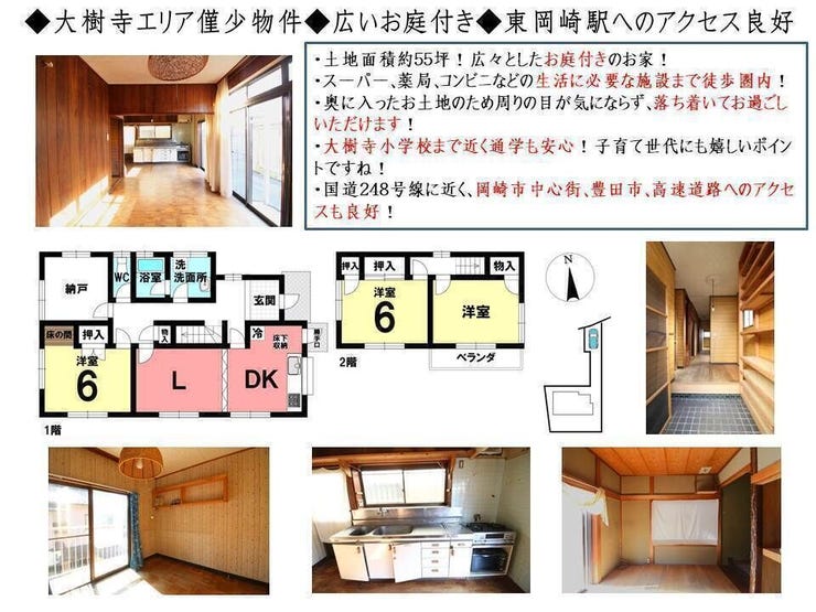広いお庭付きの中古戸建です。小学校やスーパー、薬局、コンビニ等の商業施設まで近いので、子育てもしやすく住みやすい住環境です。岡崎市中心街、豊田市、高速道路、東岡崎駅へのアクセスも良好です。