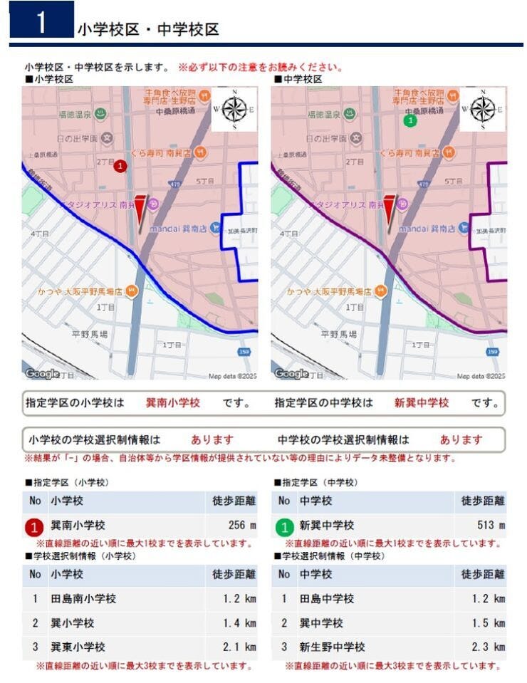 | 小学区 | 巽南小学校 徒歩4分 (約256m) | 中学区 | 新巽中学校 徒歩7分 (約513m) |