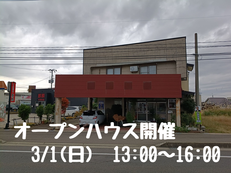 \現地見学会を開催します/ 国道13号線沿い、先日オープンした『きらく食堂』様の隣です。 開催時刻は午後13:00からの3時間となっております。 ぜひお気軽にご来場ください。