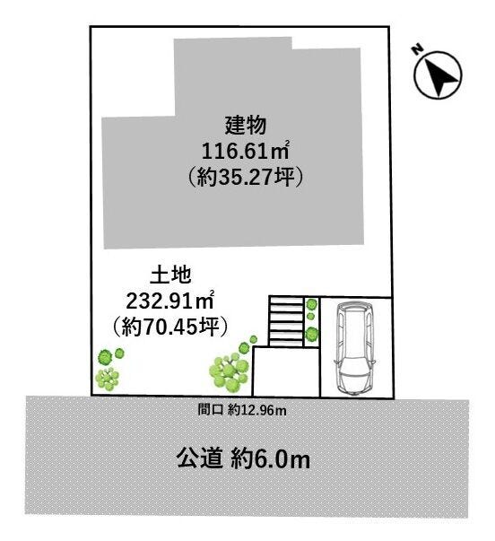 | 土地面積 | 公232.91㎡(70.45坪) | 接道 | 南西側(公道)幅 約6.0m 間口 約12.96m |