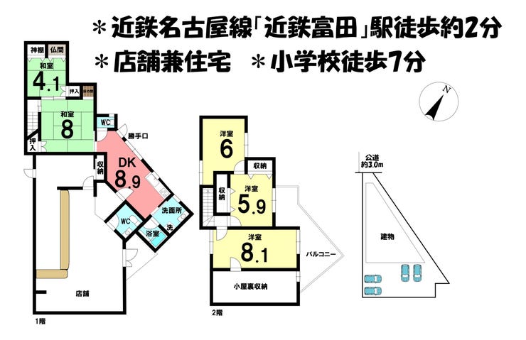 ■店舗兼住宅■近鉄「近鉄富田」駅徒歩約2分■駐車4台可■小学校徒歩約7分■広々5DK
