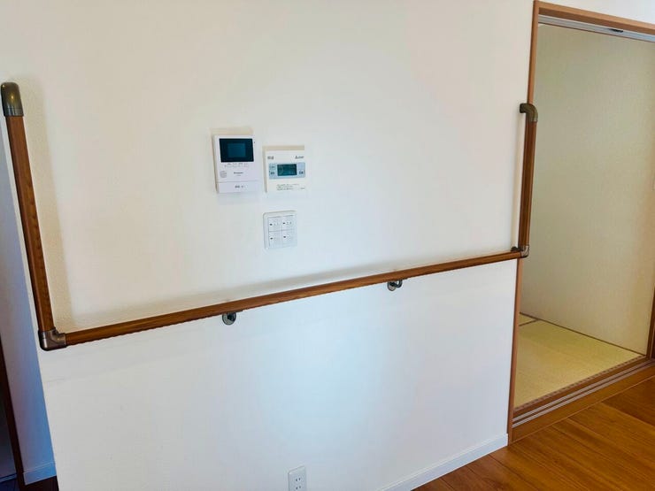 和室から洗面所への廊下・浴室・トイレに手すりが付いております。物干し部屋には物干し竿が吊るせるようになっています。