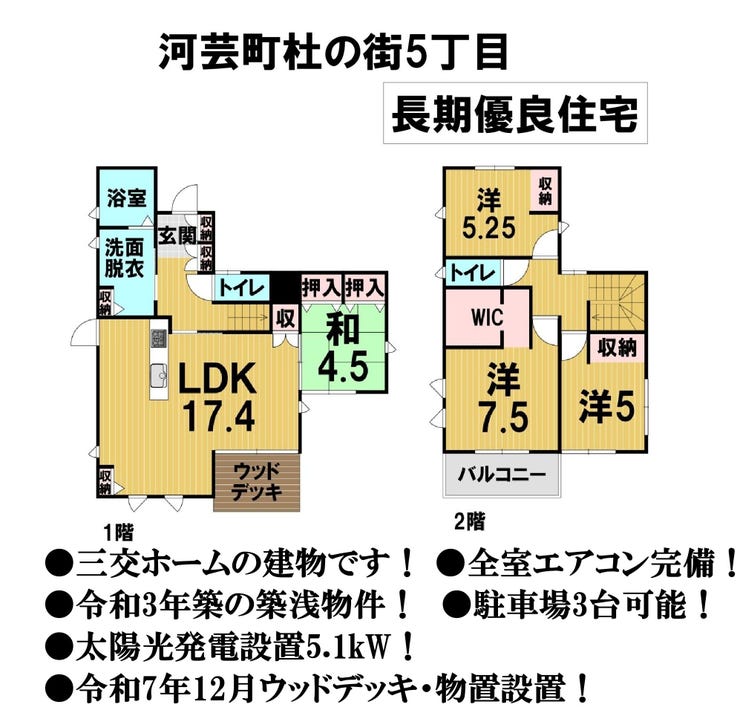 長期優良住宅!三交ホームの建物です!全室エアコン完備!太陽光発電設備5.1kw!令和3年築の築浅物件!令和7年12月ウッドデッキ・物置設置!駐車場3台可能!