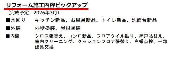| リフォーム | 【水回り】2026年03月予定 キッチン・浴室・トイレ・洗面 ○キッチン、お風呂、トイレ、洗面台新品交換 【外装】2026年03月予定 外壁 ・屋根 ○外壁塗装 ○屋根塗装 【内装】2026年03月予定 壁、天井 ・床 ○クロス、クッションフロア張替え ○フロアタイル貼り、網戸貼替え ○コンロ新品、一部建具交換 ○室内クリーニング、白蟻点検 |
