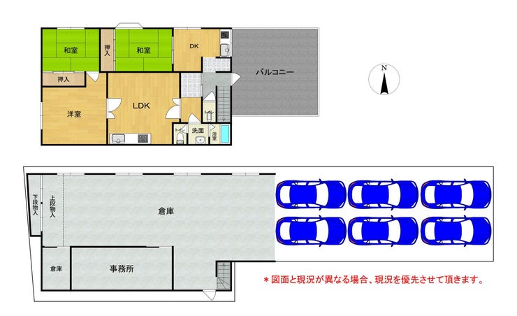 運送業の車庫として使用実績がある、事業用+住居一体型の希少物件です。車両の出入りが多い業種や、事業拠点・車庫用地をお探しの方に最適。敷地面積は約231.19㎡とゆとりがあり、1階は事務所・倉庫・車庫として実用的に活用できます。住居部分は【2LDK+1DK】の構成で、二世帯利用にも対応可能。さらにキッチン・トイレが各2つずつ備わっており、親世帯・子世帯で生活を分けながら快適に暮らせます。倉庫から住居へつながる階段動線もあり、業務と生活の行き来もスムーズ。住まいと仕事を一体で運用できる、実用性の高い物件です。