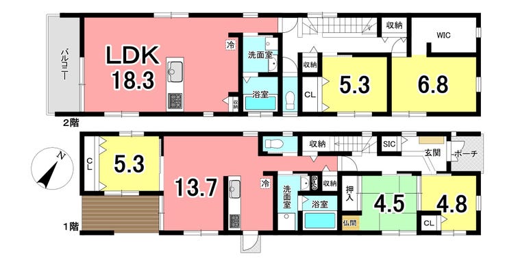 開放感あふれるLDK: 2階には18.3畳の開放的なリビング、1階には13.7畳の寛ぎ空間をご用意 。