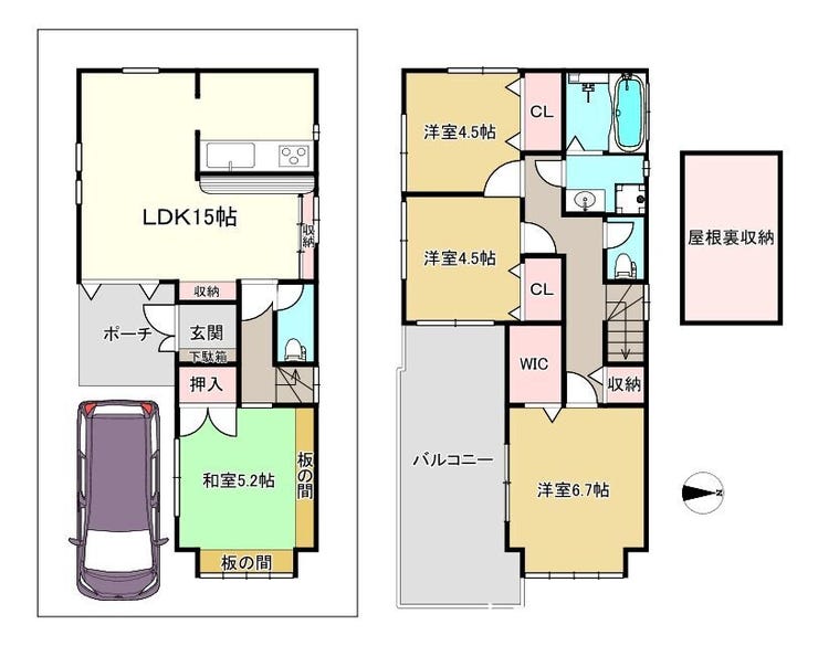 お家は使い勝手の良い4LDK。さらに、普段使わない荷物をたっぷり収納できる「屋根裏収納」がついているのが嬉しいポイント。これなら、お部屋に荷物が溢れることなく、家族みんなのリビングスペースを広々と使っていただけますね。