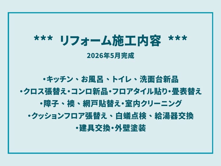 | 備考 | ・駐車台数:縦列2台 ・瑕疵保険(国交省指定)保証付 〈リフォーム施工内容ピックアップ〉完成予定:2026年5月 ・水回り:キッチン新品、お風呂新品、トイレ新品、洗面台新品 ・外装:外壁塗装 ・内装:クロス張替え、コンロ新品、フロアタイル貼り、畳表替え、障子貼替え、襖貼替え、網戸貼替え、室内クリーニング、クッションフロア張替え、白蟻点検、給湯器交換、建具交換 |