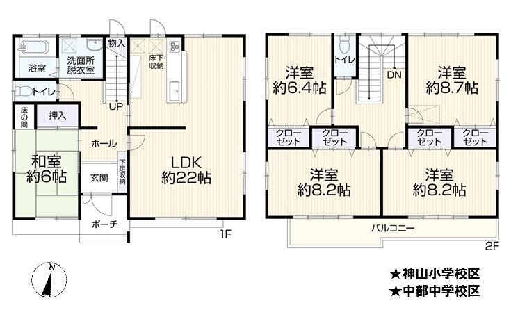 | 小学区 | 神山小学校 徒歩18分 (約1400m) | 中学区 | 中部中学校 徒歩19分 (約1500m) |