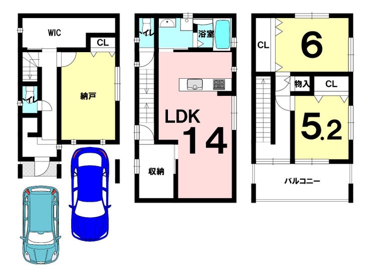 2SLDKの間取りに加え、WICや納戸など収納スペースが充実。