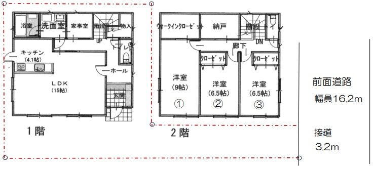 | 土地面積 | 実165.66㎡(50.11坪) | 接道 | 北東側(公道)幅 約16.2m 間口 約3.20m |