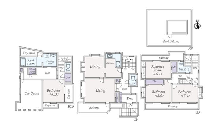 ・1階・2階にバルコニー、屋上に水栓付ルーフバルコニー