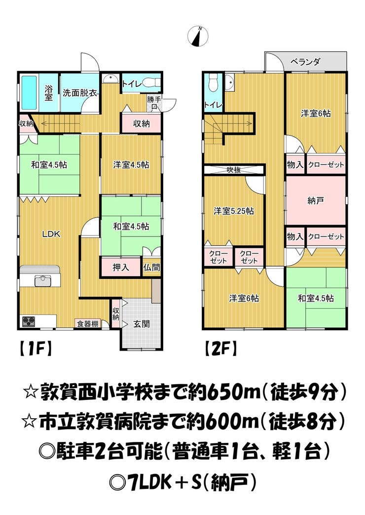 ☆敦賀西小学校まで約650m(徒歩9分) ◎駐車2台可能(普通車1台、軽1台)◎7LDK+S(納戸)