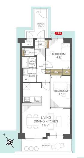 | 専有面積 | 壁芯 55.45㎡ | 所在階 | 12階建/8階部分 |