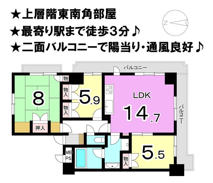 ■東南角部屋 ■二面バルコニー ■近隣に商業施設多数有り ■駅まで徒歩3分