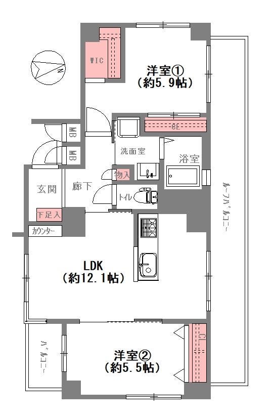 - 2面バルコニー