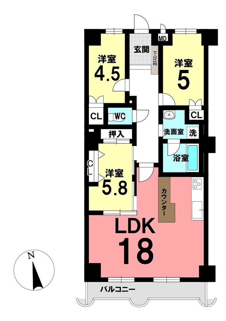 南向きで陽当り良好、18帖の広々リビングが家族の時間を包みます。