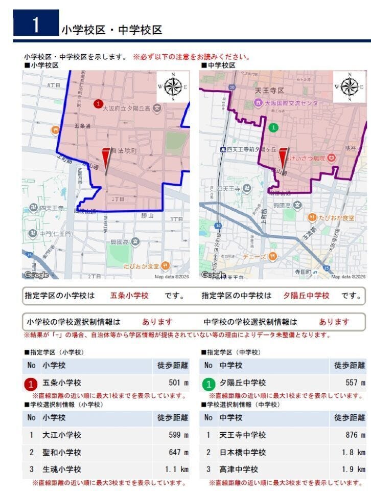 | 小学区 | 五条小学校 徒歩7分 (約525m) | 中学区 | 夕陽丘中学校 徒歩9分 (約664m) |