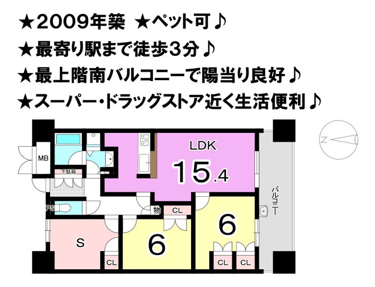 ■2009年築 ■ペット可 ■駅まで徒歩3分 ■最上階南バルコニー ■スーパー等近く生活便利