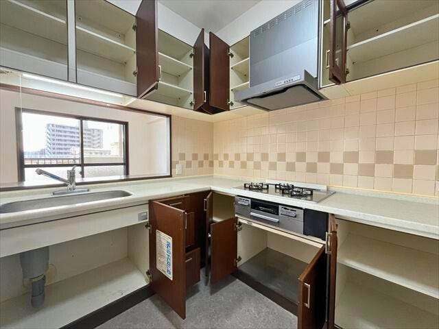 カウンター付きのL字型キッチンは、配膳がスムーズ&調理効率も良好♪