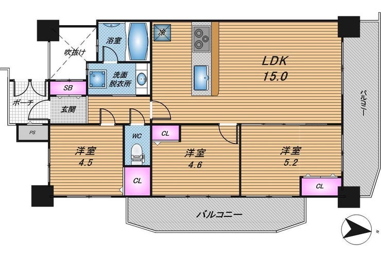 3LDK♪15帖LDK×2面バルコニー♪食洗機付きキッチンや浴槽付きバスなど設備が整った住まい!