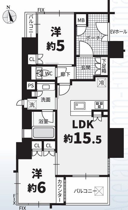 | 専有面積 | 壁芯 55.58㎡ | 所在階 | 12階建/8階部分 |
