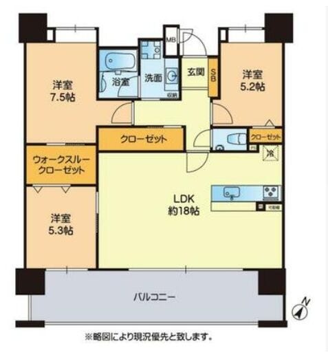 約18帖のLDKは南東向きで陽当たり良好。大きな開口部から光が差し込み、明るく開放的な空間が広がります。6階部分につき前面の建物との距離があり、空が広く感じられる眺望も魅力です。洋室は7.5帖・5.3帖・5.2帖の3部屋を確保し、ウォークスルークローゼットなど収納も充実。室内をすっきり保てる使い勝手の良い間取りです。