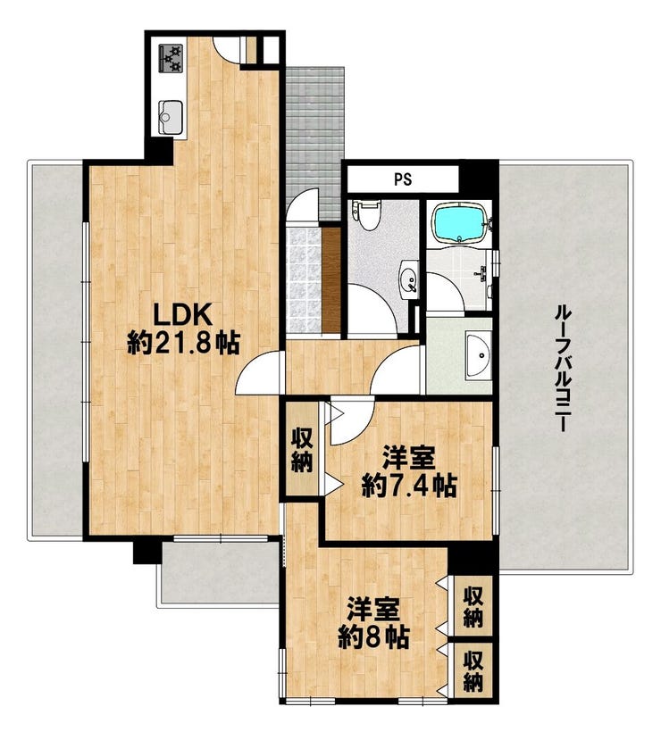 洋室は8帖と7.4帖の2部屋を確保しており、収納も充実。