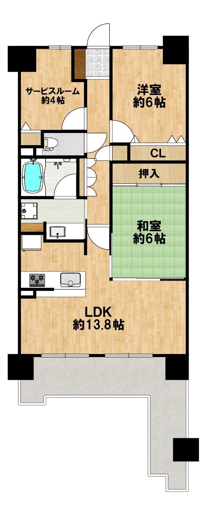 約14平米の広々としたバルコニーは、プライベート空間を感じさせてくれるL字型を採用しています。