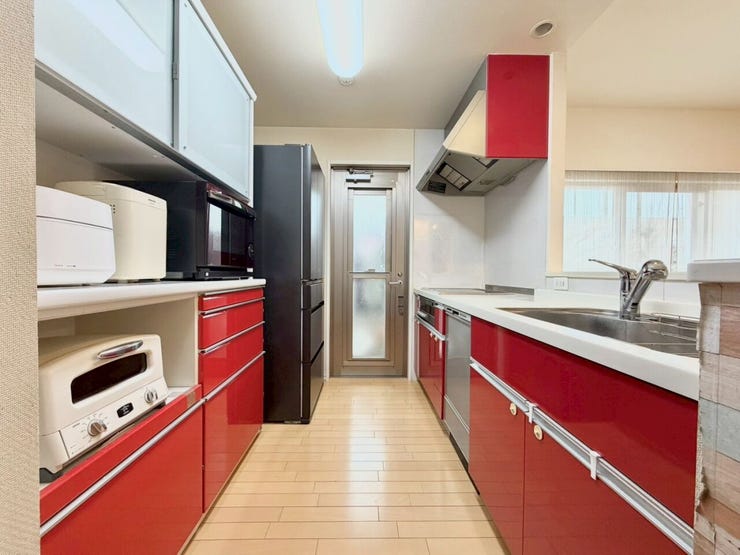 空間のアクセントになる真っ赤なキッチンは、食洗機も完備した機能派。