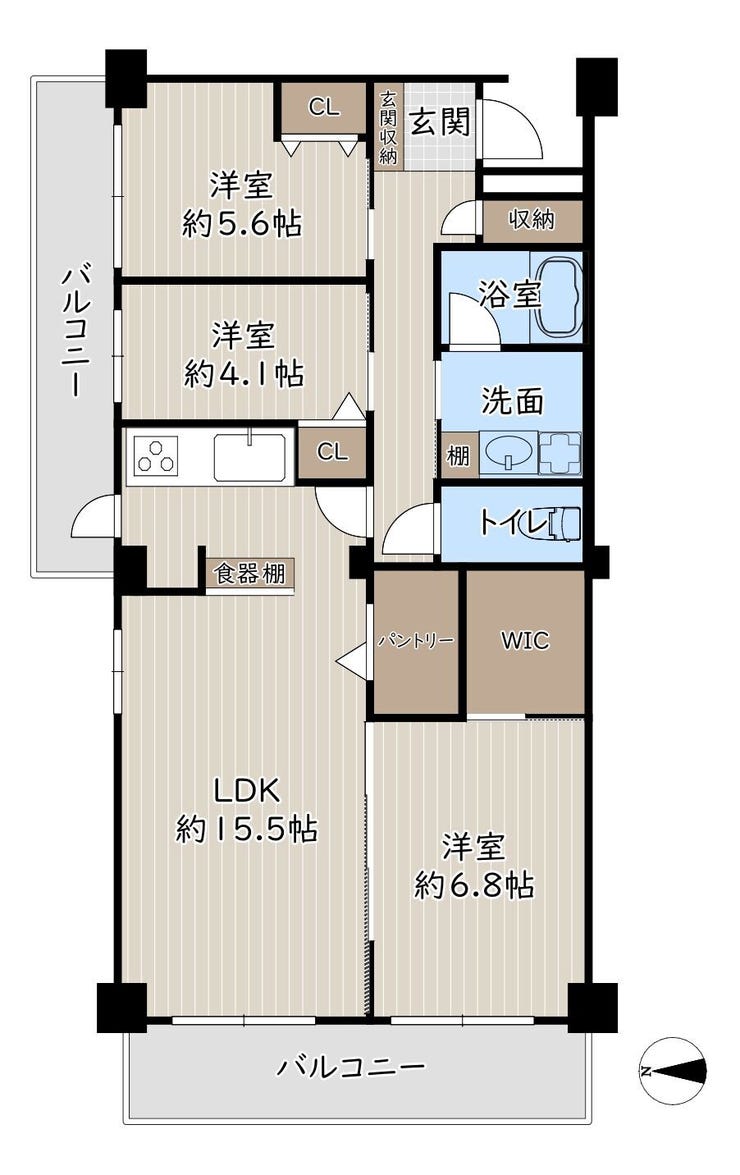 全室に窓がある角部屋で開放的な暮らし。WICやパントリーなど収納も充実し、お部屋をスッキリ保てます。
