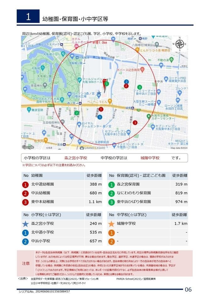 | 小学区 | 森之宮小学校 徒歩3分 (約237m) | 中学区 | 城陽中学校 徒歩22分 (約1700m) |