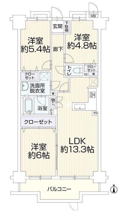 専有面積67.27平米の室内は、約13.3帖の広々としたLDKを中心に、各居室にクローゼットを備えた収納豊富な設計です 。