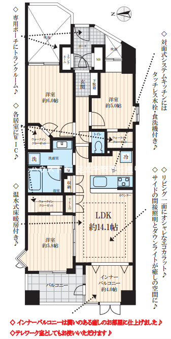 収納力の高さと立地の良さを兼ね備えたおすすめ物件です。3つのウォークインクローゼットに加え、トランクルームや専用ポーチもあり、お荷物の多い方でもすっきりとした生活が可能です。室内はリノベーション済みで、水回り設備も一新されており、すぐに快適な新生活をスタートできます。インナーバルコニーは趣味スペースやテレワークにも活用できる点も魅力です。駅徒歩7分に加え、周辺には大型商業施設やスーパーが充実しており、日々の生活にも便利な環境です。ぜひ一度ご覧ください。