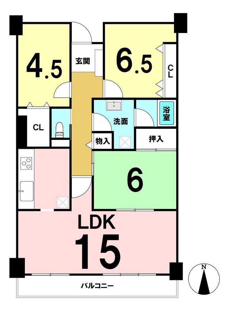 専有面積76.95㎡、LDK約15帖のゆとりある間取りで、ご家族でも使いやすい住まい。