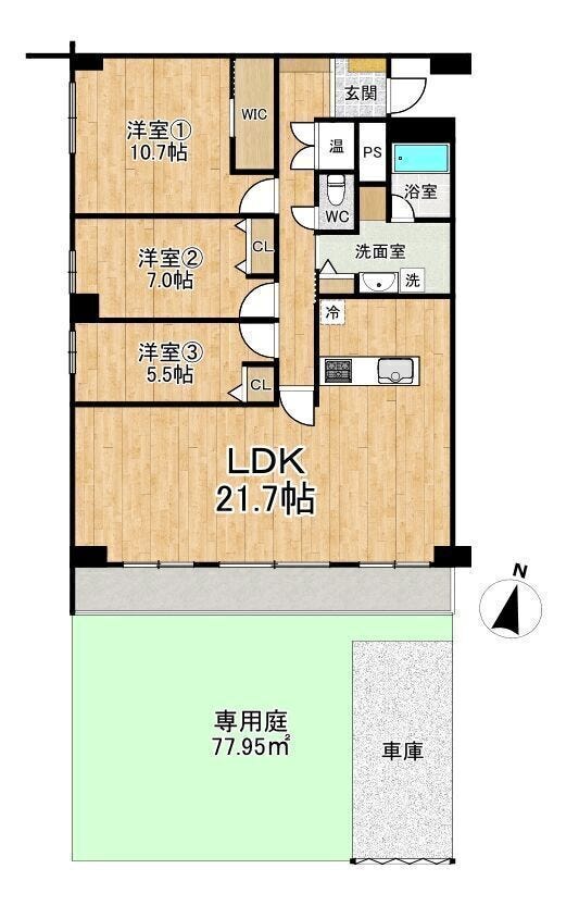 【77.95㎡の専用庭、専用駐車場付き】専有面積107.06㎡の広々ゆとりあるお住まい。