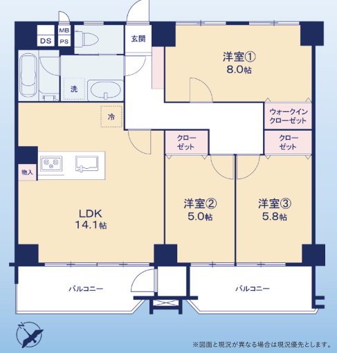 | 主要採光 | 南東向 | バルコニー | 南東向12.84㎡ |