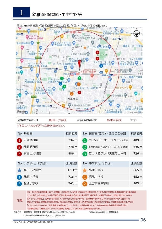 | 小学区 | 真田山小学校 徒歩14分 (約1100m) | 中学区 | 高津中学校 徒歩9分 (約650m) |