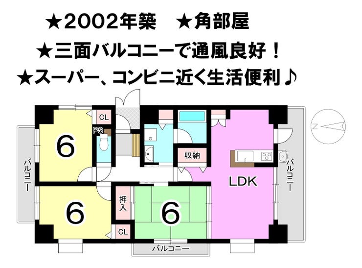 ■2002年築 ■角部屋、三面バルコニーで通風良好 ■スーパー・コンビに等近く生活便利