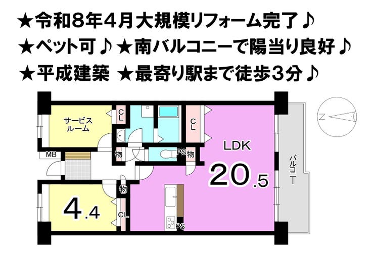 ■令和8年4月リフォーム完了 ■ペット可 ■南バルコニー ■平成建築 ■駅まで徒歩3分