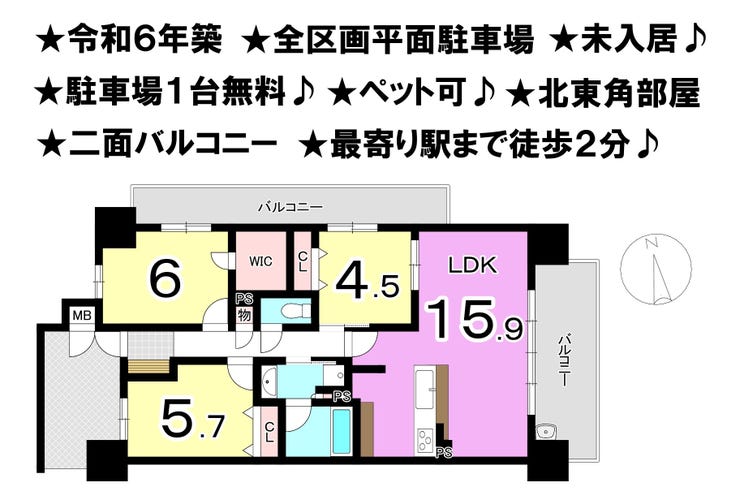 ■令和6年築 ■全区画平面駐車場 ■駐車場1台無料 ■ペット可 ■二面バルコニー